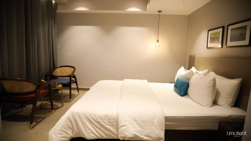 space, and a roomy wardrobe. The separate living area features a soft sofa cum bed and a desk space for your convenience. There's also a